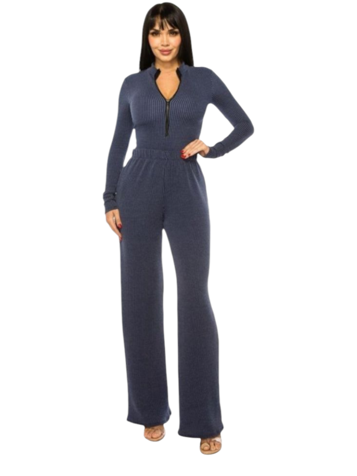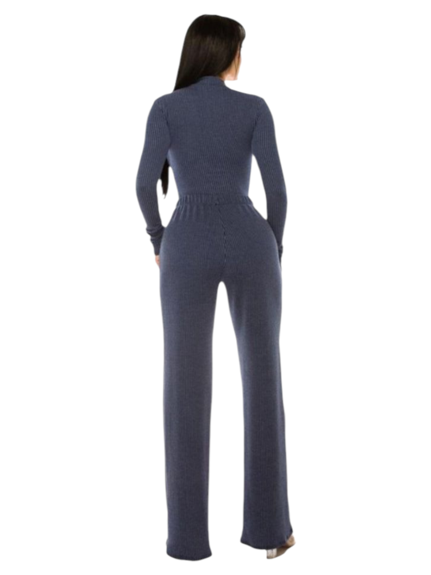 The jumpsuit features a zippered front with a high collar, adding a modern and versatile touch. The fitted waist and wide - leg pants create a flattering silhouette, perfect for acomfortable yet stylish look.
