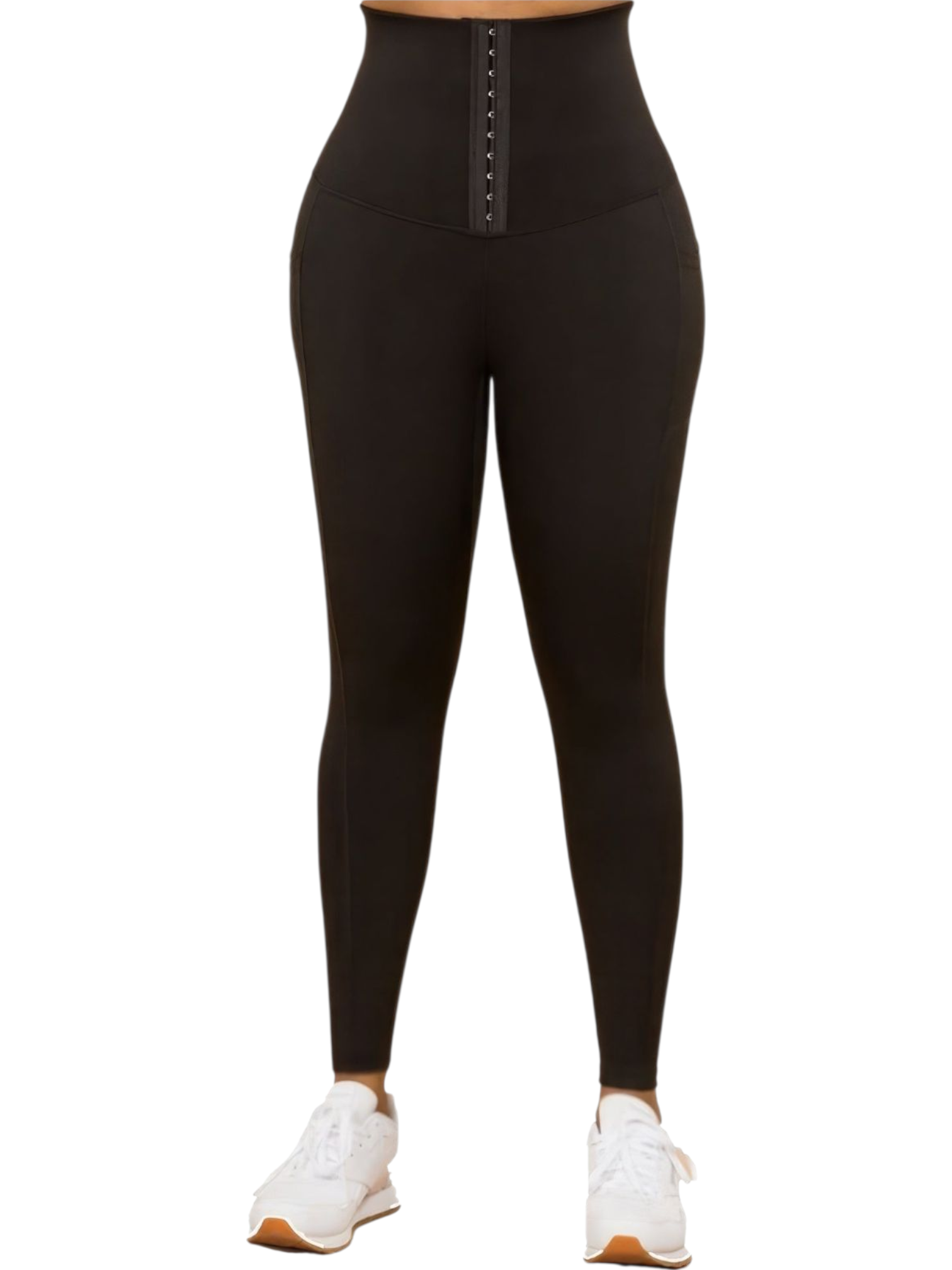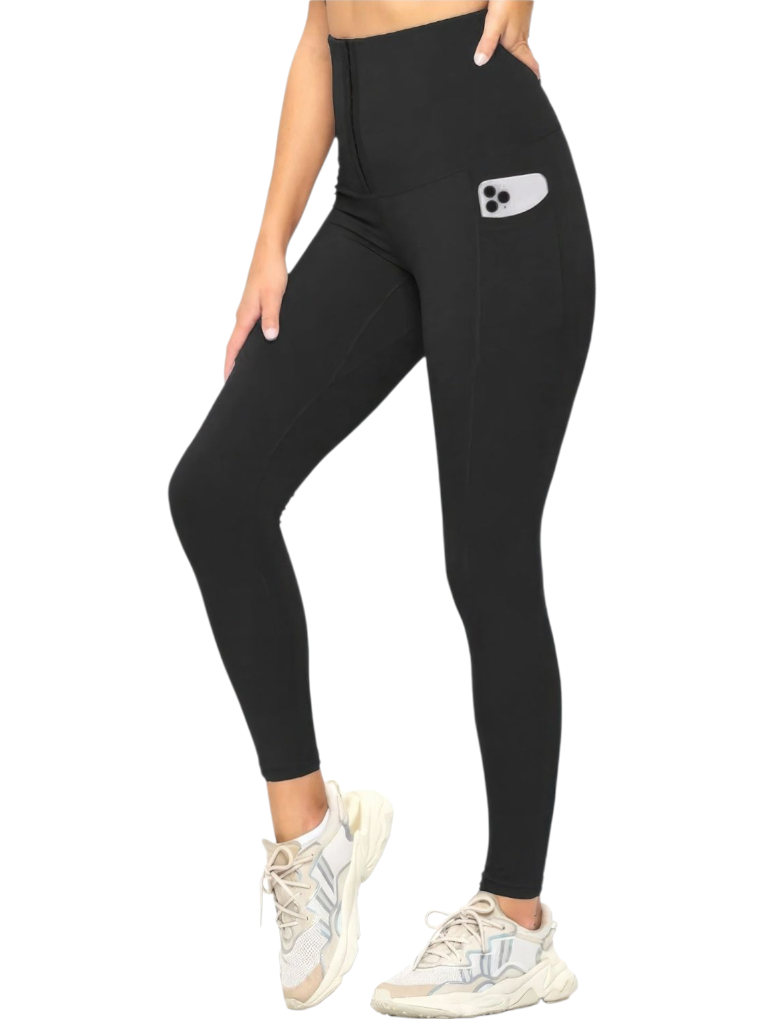 - "Absolutely love these leggings! The wide waistband with hooks closure really slims the tummy, and the side pockets are so handy. The black color is classic and versatile!" - A.N.