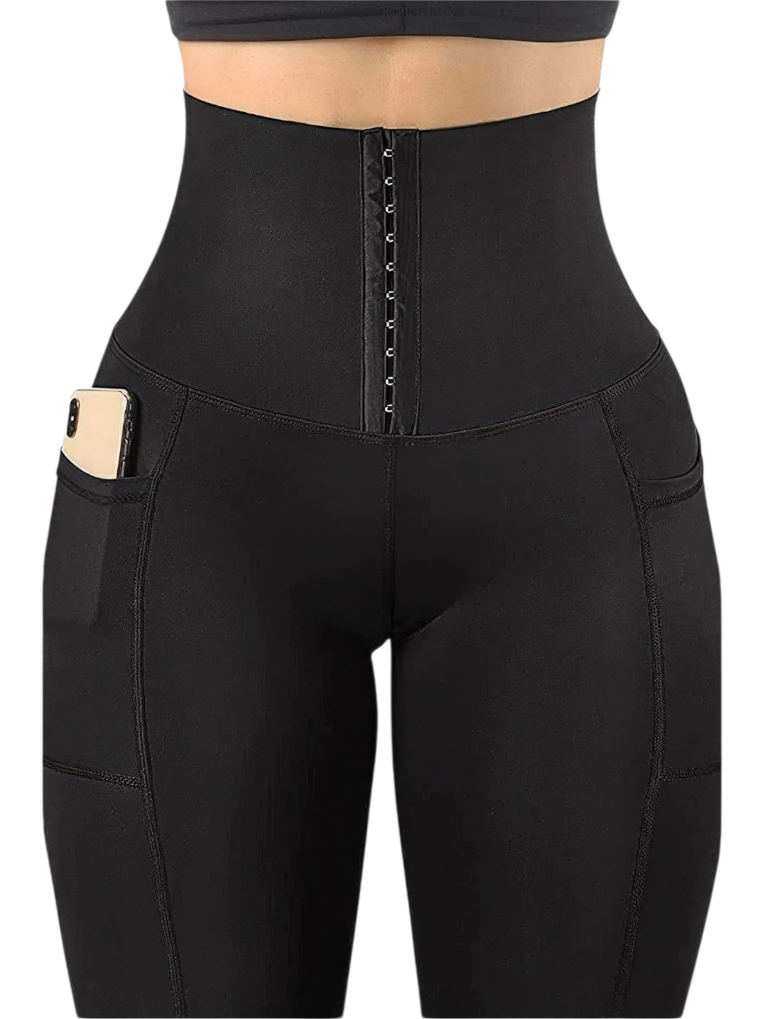 These leggings feature a wide waistband with three rows of hooks closure, offering higher compression on the tummy for a slim, natural curve look. Stay stylish and functional with convenient side cellphone pockets during your workouts.