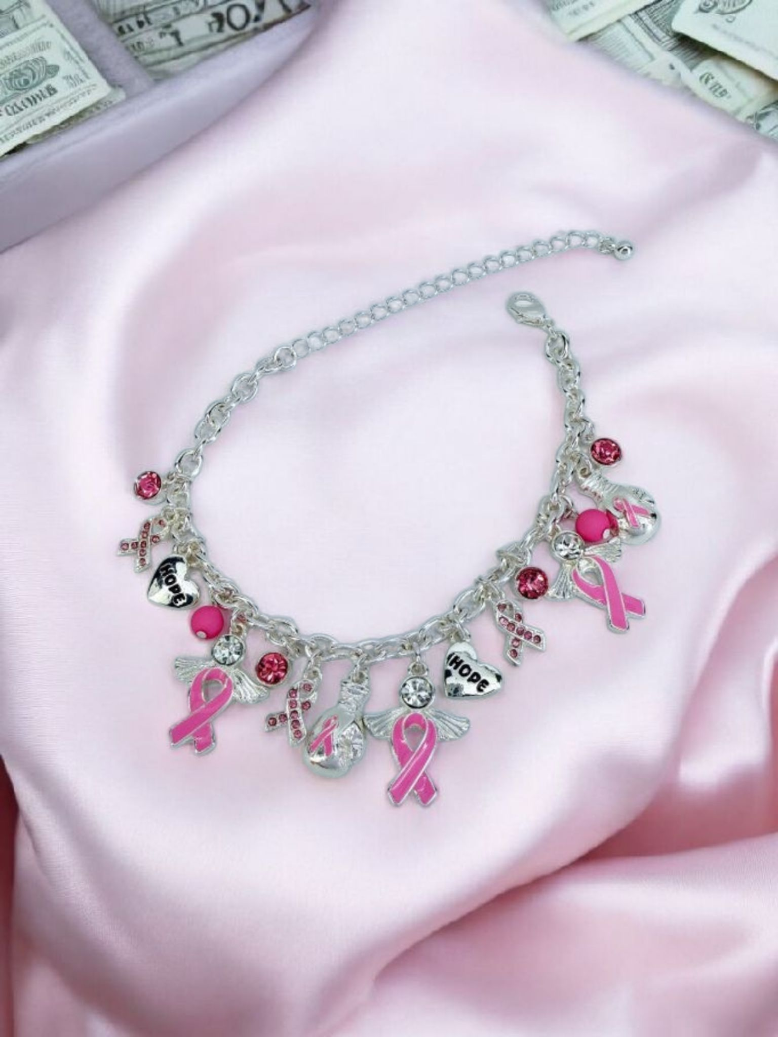 Silver Finish Chain Pink Ribbon Cancer Awareness Charms Bracelet