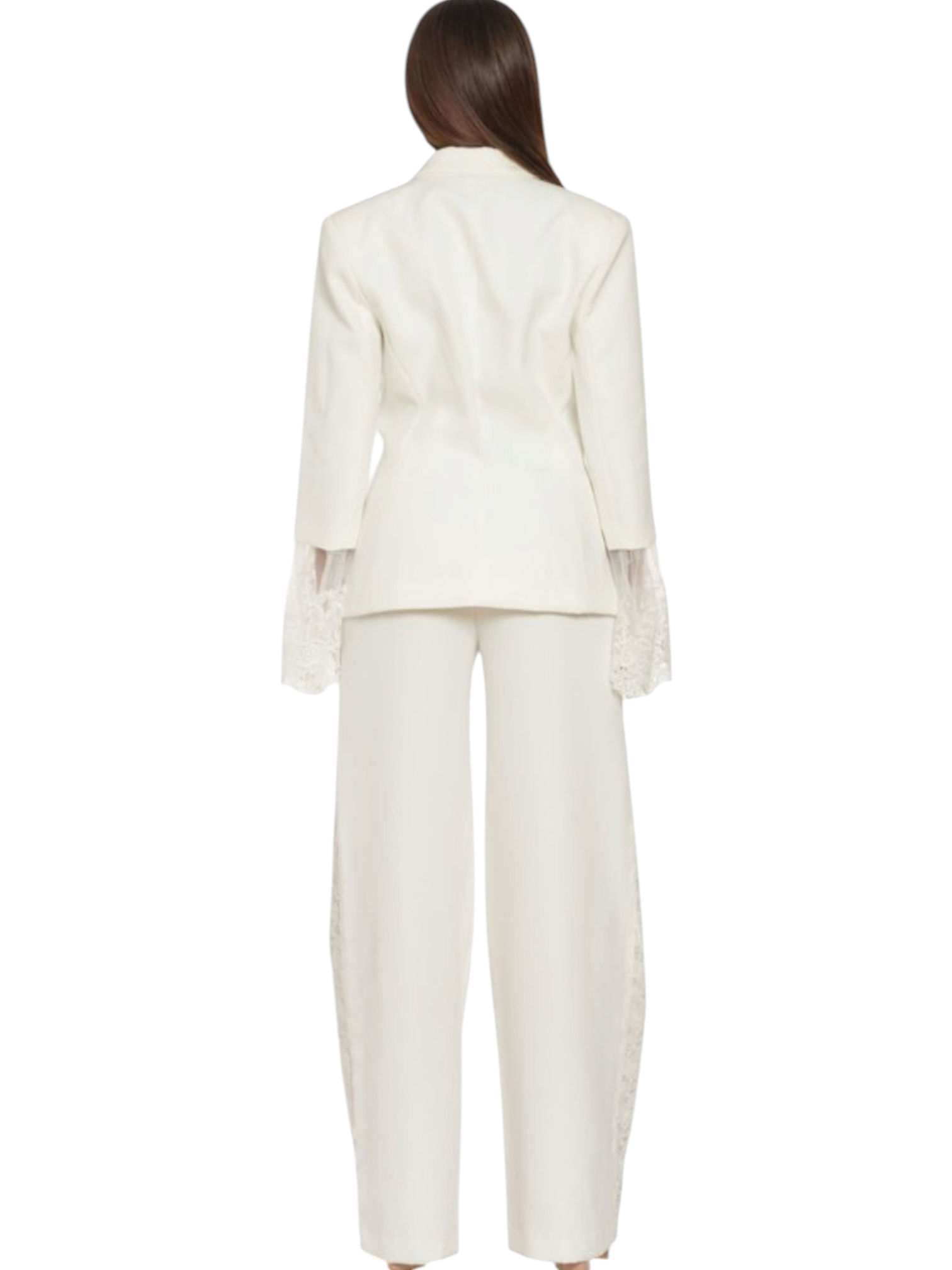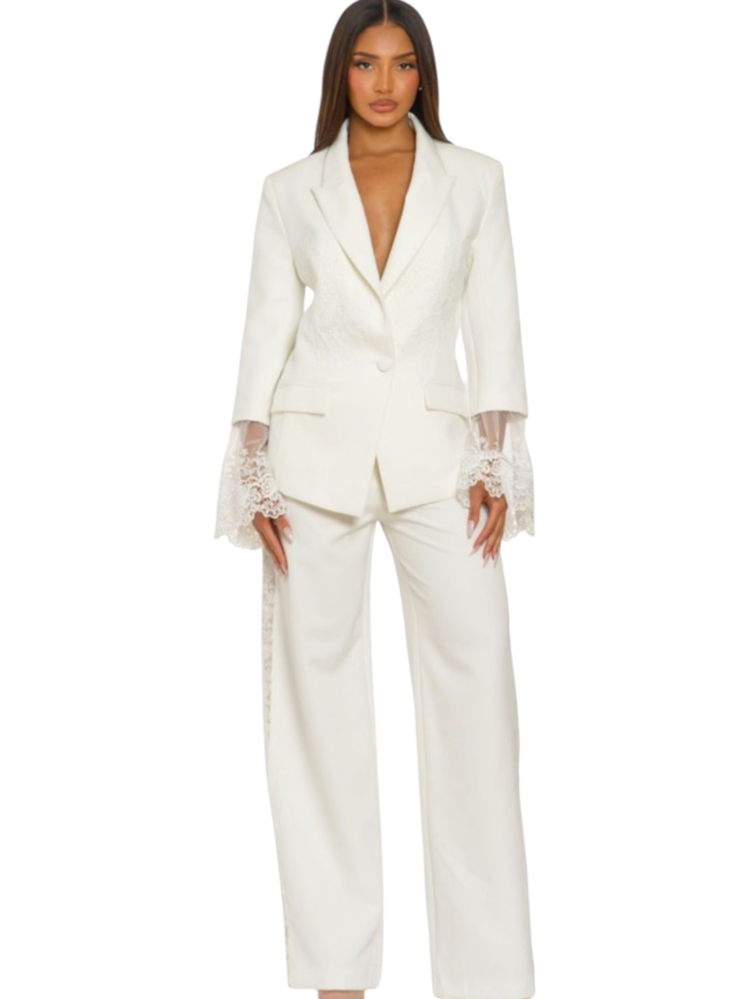 A timeless ensemble that marries power dressing with delicate femininity. This set features a structured blazer adorned with subtle lace embroidery for a touch of romance paired with dramatic lace cuffs that peek through the sleeves for added flair.