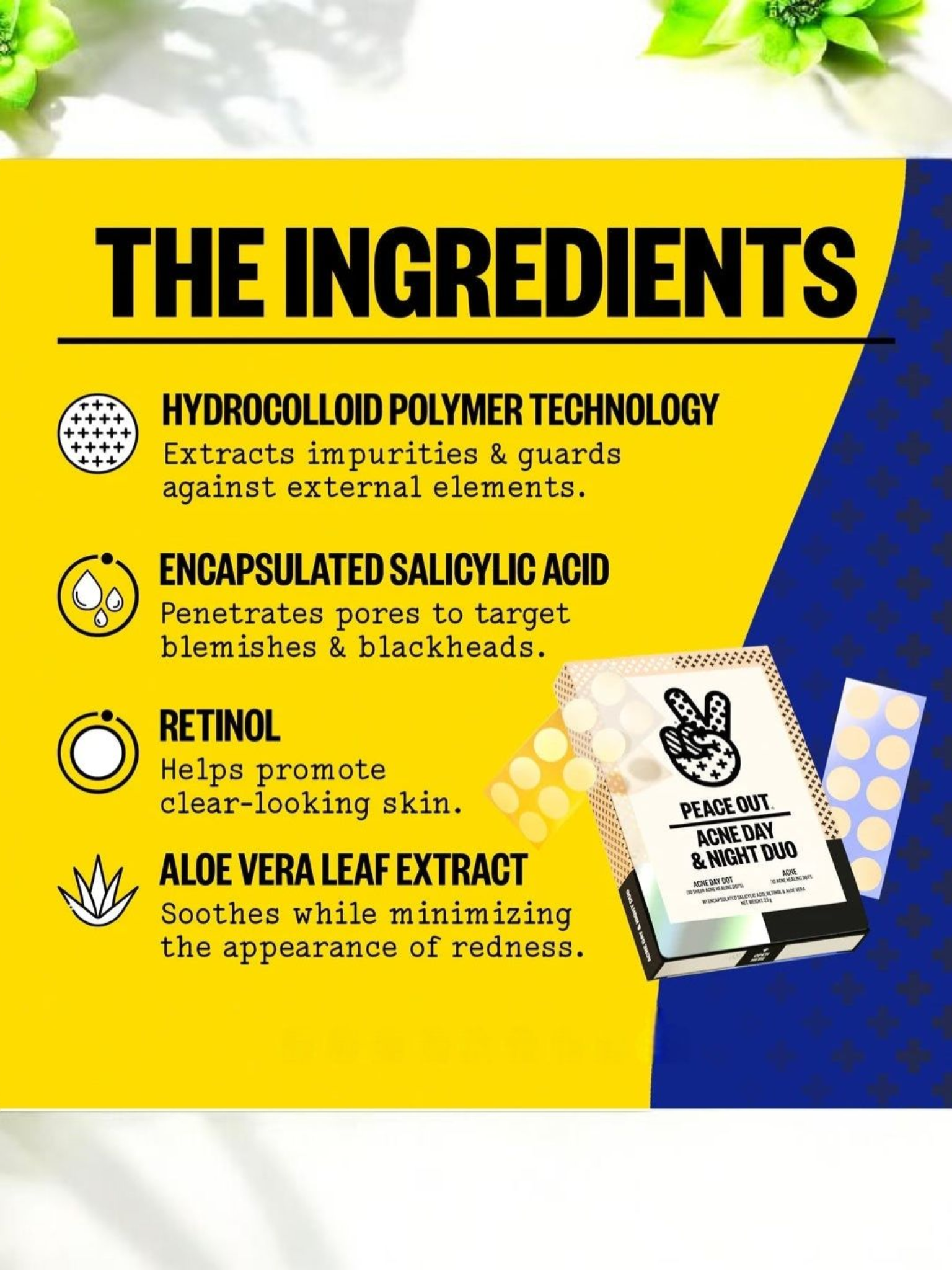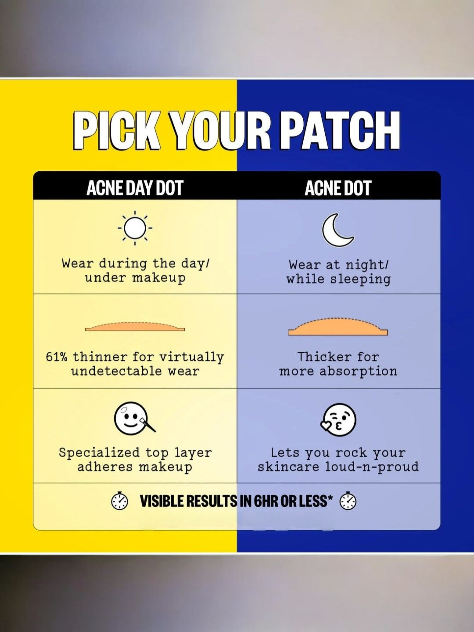 Your day-to-night acne treatment duo! Day Dots are designed to be your invisible daytime acne solution (under makeup or not) and original Acne Dots are your heavy hitter for peskier breakouts overnight. Both feature clean Hydrocolloid Polymer Technology, Salicylic Acid, Retinol, and Aloe Vera for clearer looking skin in 6 hours or less