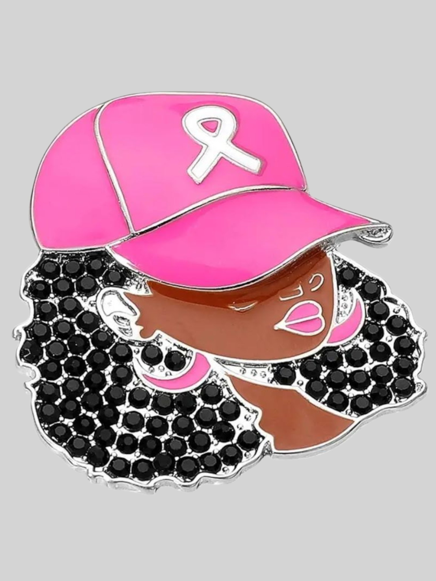 This unique awareness brooch features a stylish figure in a pink cap adorned with a ribbon emblem, sparkling crystal-accented hair, and bold enamel details. A fashionable way to show support and raise awareness, it blends empowerment with stando ut style for any outfit or accessory.