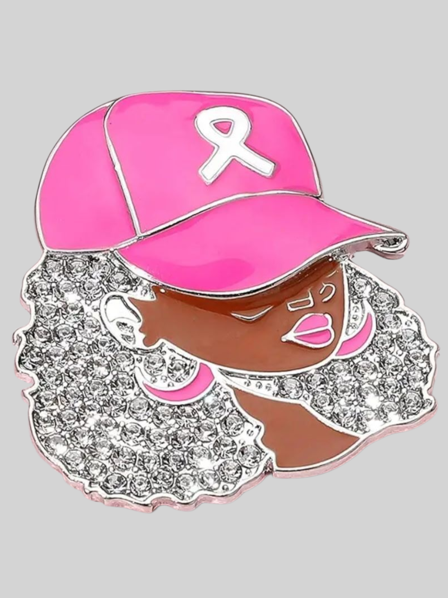 This unique awareness brooch features a stylish figure in a pink cap adorned with a ribbon emblem, sparkling crystal-accented hair, and bold enamel details. A fashionable way to show support and raise awareness, it blends empowerment with stando ut style for any outfit or accessory.